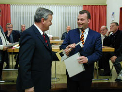 Beständigkeit prägte auch die Politik in Eschenburg: Seit der Gründung kam die Gemeinde mit nur drei Bürgermeistern aus. Von 1972 bis 1992 war Otto Friedrich Schlemper (CDU) der erste Rathaus-Chef der Großgemeinde, nachdem er bereits das zuvor selbstständige Eibelshausen als Oberhaupt geführt hatte. Von 1993 bis 2004 lenkte Walter Jank (CDU) zwei Amtszeiten lang die Geschicke. Seit dem 1. Januar 2005 ist Götz Konrad (parteilos) sein Nachfolger – derzeit der jüngste Bürgermeister im Lahn-Dill-Kreis (rechts auf dem Foto unten).