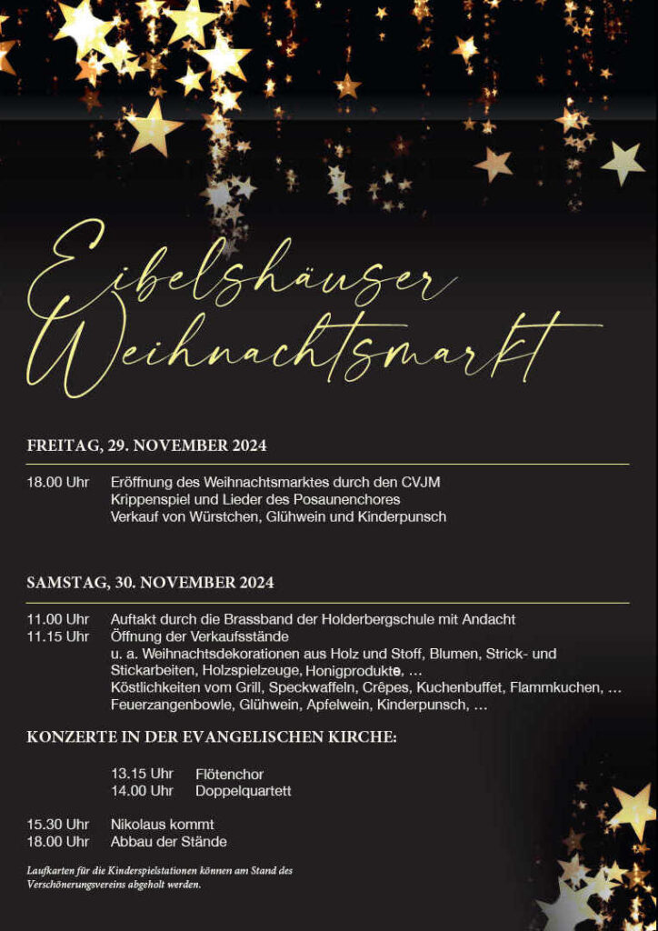 Der Eibelshäuser Weihnachtsmarkt startet am Freitag (29. November) um 18.00 Uhr mit Krippenspiel und Lieder des Posaunenchores. Mit Würstchen, Glühwein und Kinderpunsch geht es weiter.  Am Samstag startet das Weihnachtsdorf zwischen Marktplatz-Brücke und Kirche um 11.00 Uhr mit Auftakt durch die Brassband der Holderbergschule und Andacht. Um 11.15 Uhr öffnen die Verkaufsstände.