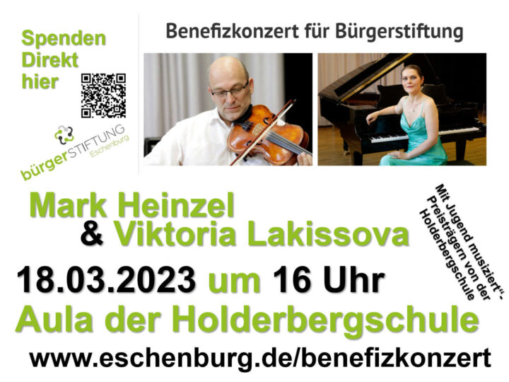 Wie es der Zufall will, sind die Heinzels eine musikalische Familie. Seit fünf Generationen spielt in jeder Generation mindestens ein Heinzel ein Streichinstrument. Und so lag es nahe, dass Mark Heinzel und seine Ehefrau Viktoria Lakissova, Professorin für Klavier an der Universität der Künste Berlin, der Gemeinde Eschenburg ein gemeinsames Benefizkonzert anboten, dessen Erlös vollständig in das Grundstockvermögen der „Stiftung für Eschenburg“ fließen soll. Das Konzert war für den Oktober 2020 geplant. Die Corona-Krise hat es immer wieder verzögert, bereits gefundene Termine mussten mehrmals abgesagt werden. Nun ist es so weit: Die Gemeinde Eschenburg und die „Stiftung für Eschenburg“ laden Sie herzlich zu diesem Benefizkonzert ein.