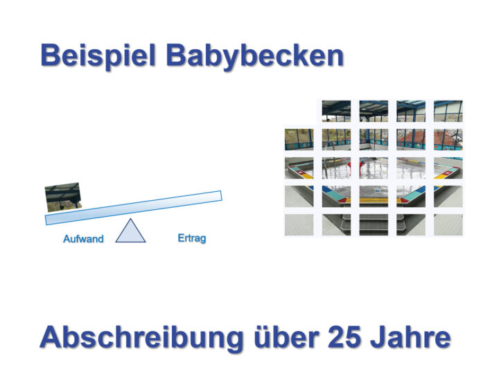 Beispiel Babybecken: Ein Ersatz für das Kinderplanschbecken im Schwimmbad hatten wir weder einen Plan noch im Bauprogramm. Deshalb haben wir aus der Not eine Tugend gemacht. Für diese neue Attraktion sammeln wir zusammen mit dem Förderverein Spenden, „Benefiz fürs Babybecken“. Hierbei kann man sagen, dass jeder Euro Spende dem gesamten Schwimmbad hilft in den kommenden 25 Jahren. Warum ist das?