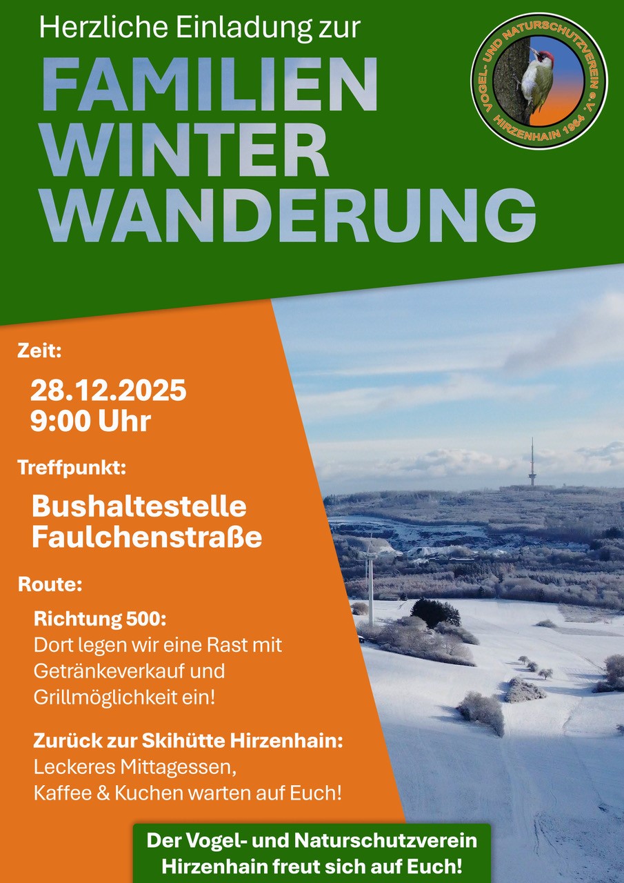 Zeit: 28.12.2025 9:00 Uhr Treff punkt: Bushaltestelle Faulchenstraße Route: - Richtung 500: Dort legen wir eine Rast mit Getränkeverkauf und Grillmöglichkeit ein! - Zurück zur Skihütte Hirzenhain: Leckeres Mittagessen, Kaffee & Kuchen warten auf Euch! Der Vogel- und Naturschutzverein Hirzenhain freut sich auf Euch!